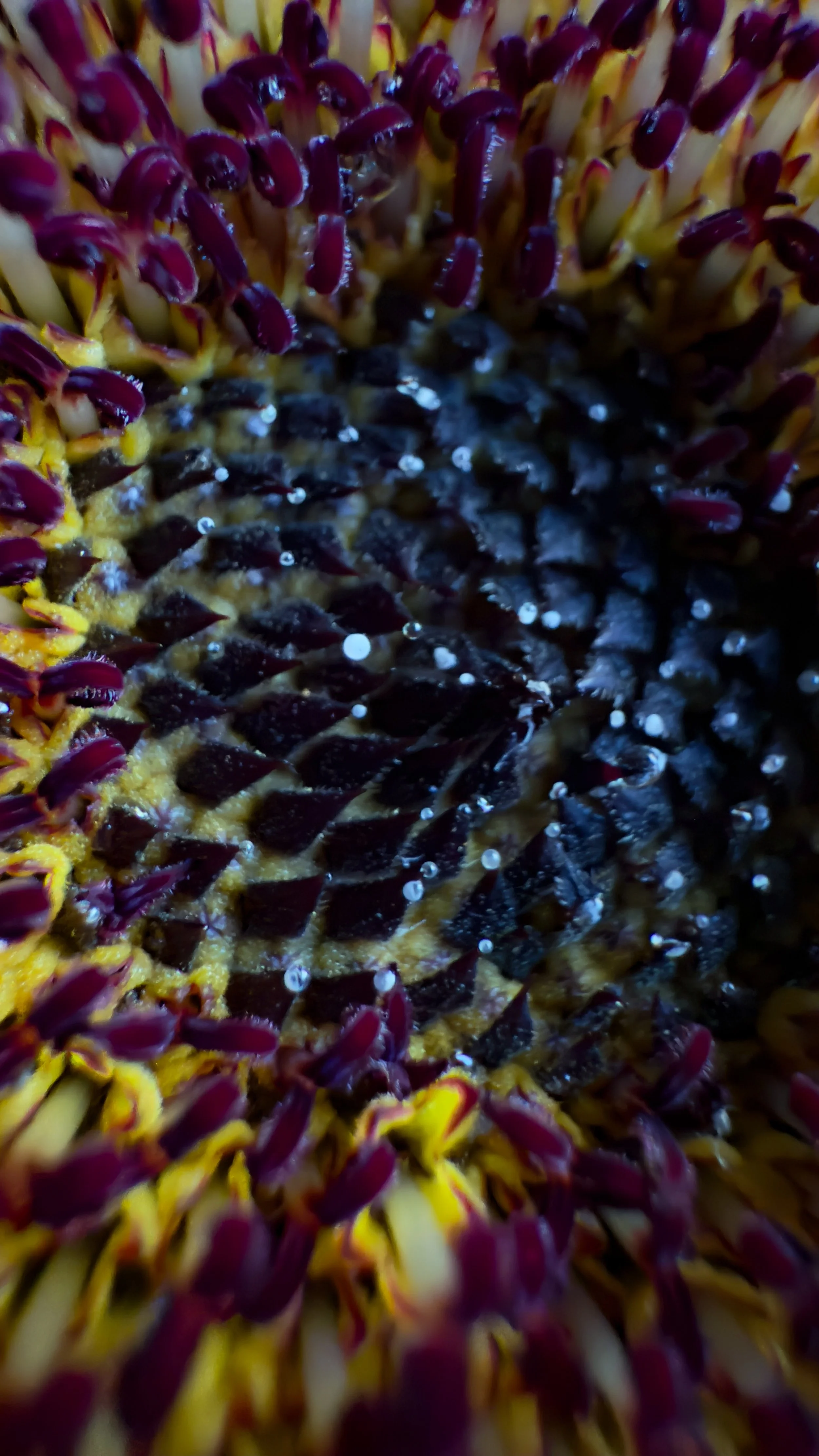 Sunflower macro Oct 4 Written By BlueYonder365 Love the pollen on one and the smallest drop of water i could hardly see BlueYonder365